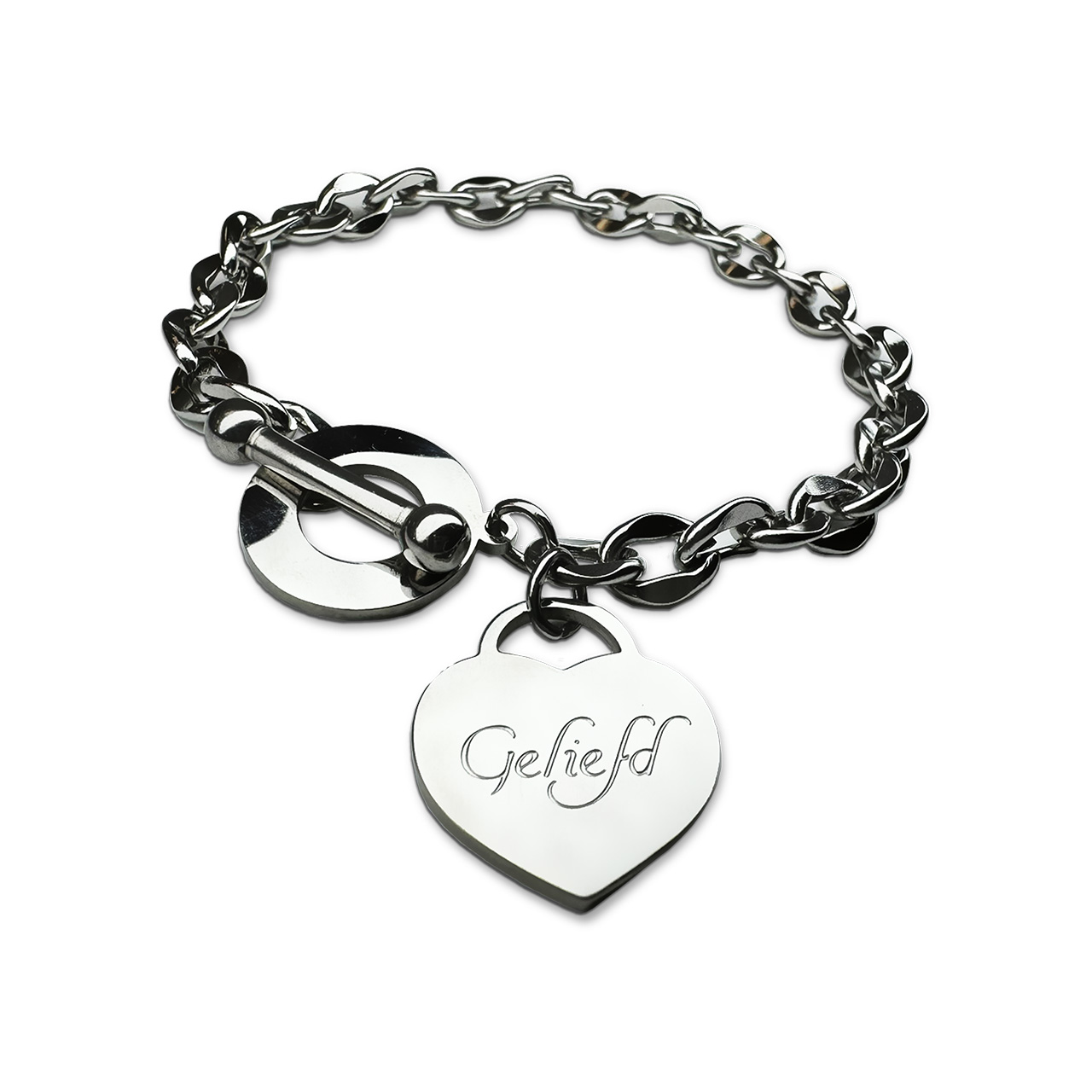 Elegante armband met siersluiting en subtiel bedeltje waarin het woord ‘Geliefd’ gegraveerd is. Een waardevol sieraad met een liefdevolle boodschap. Verkrijgbaar in goud-, rosé- en zilverkleur.