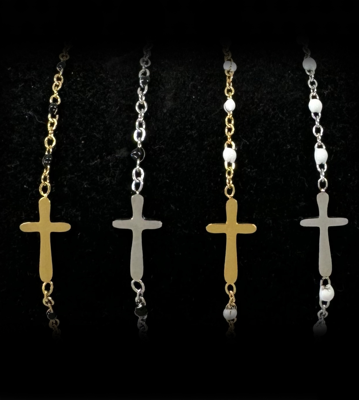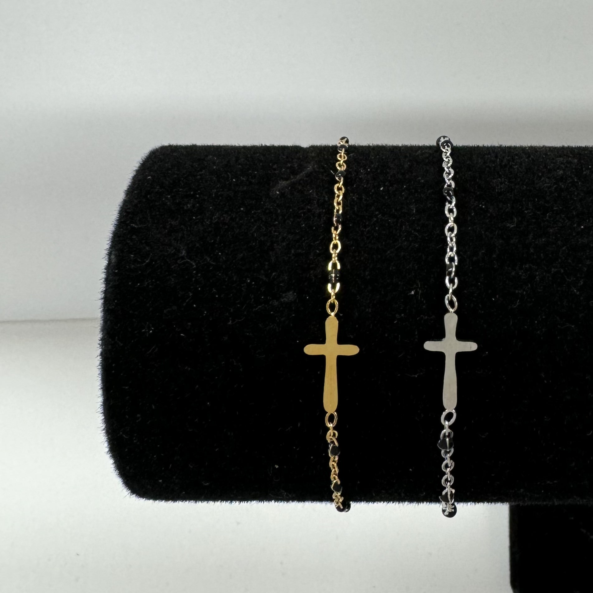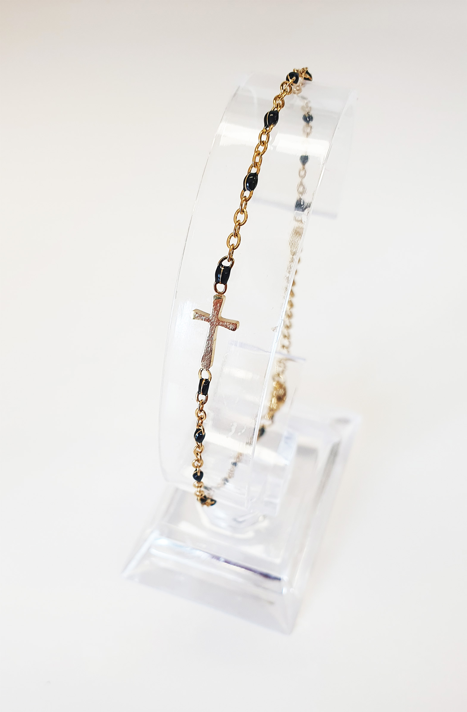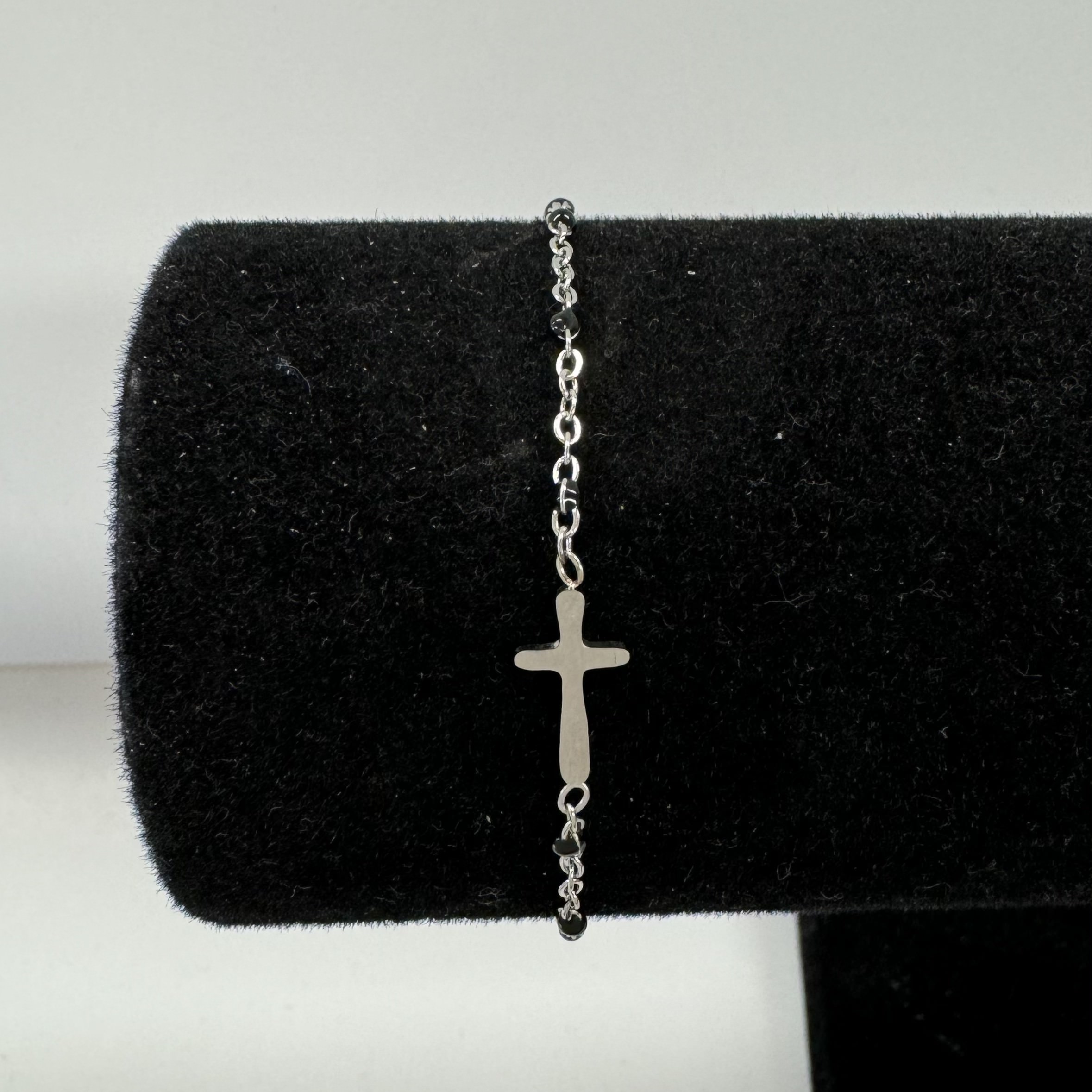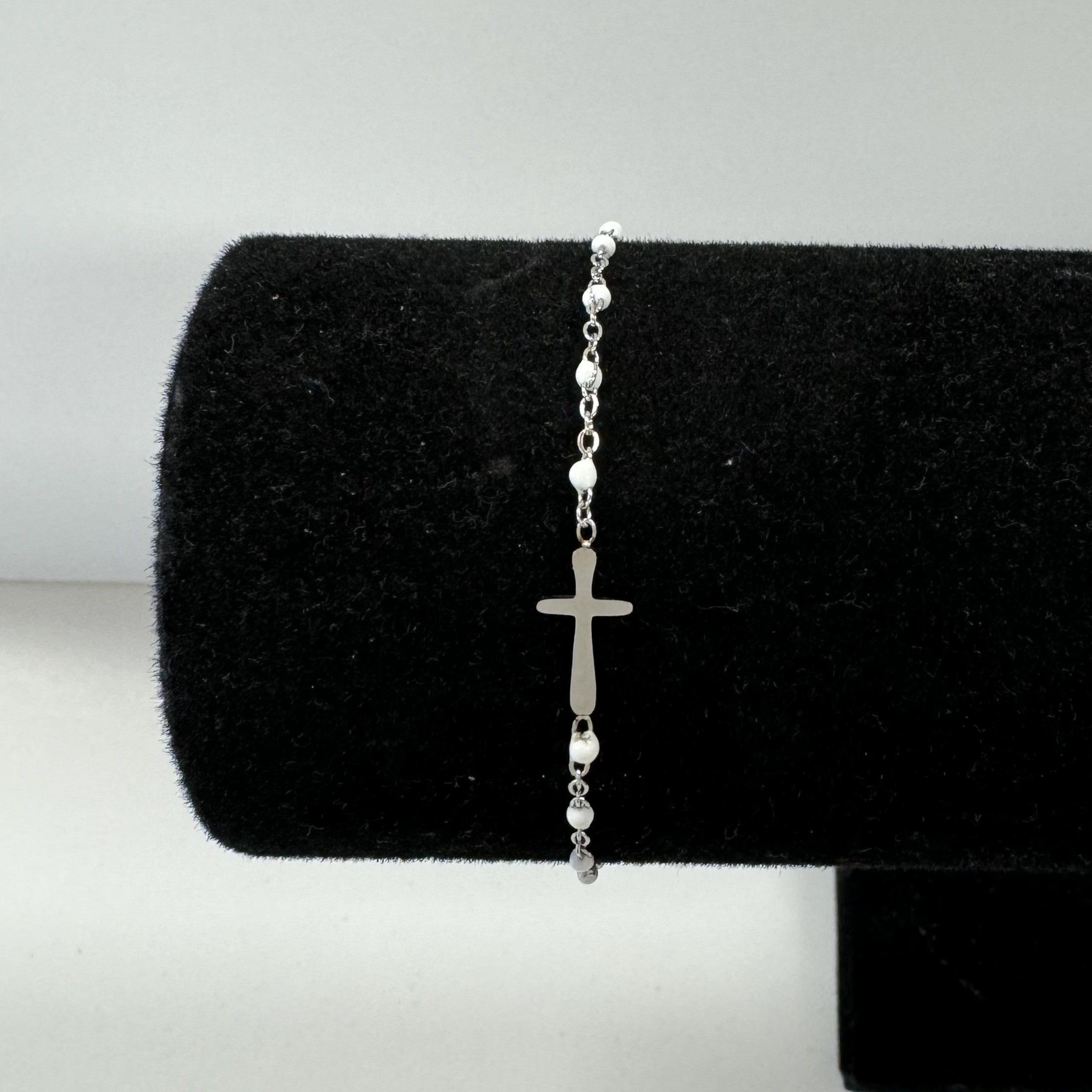 Stijlvol armbandje met kraaltjes en een klein kruisje – een subtiele manier om jouw geloof te laten zien.