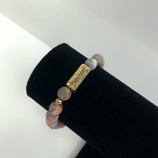 Prachtige natuurstenen armband met goudkleurige accenten en de gravure ‘Blessed’.