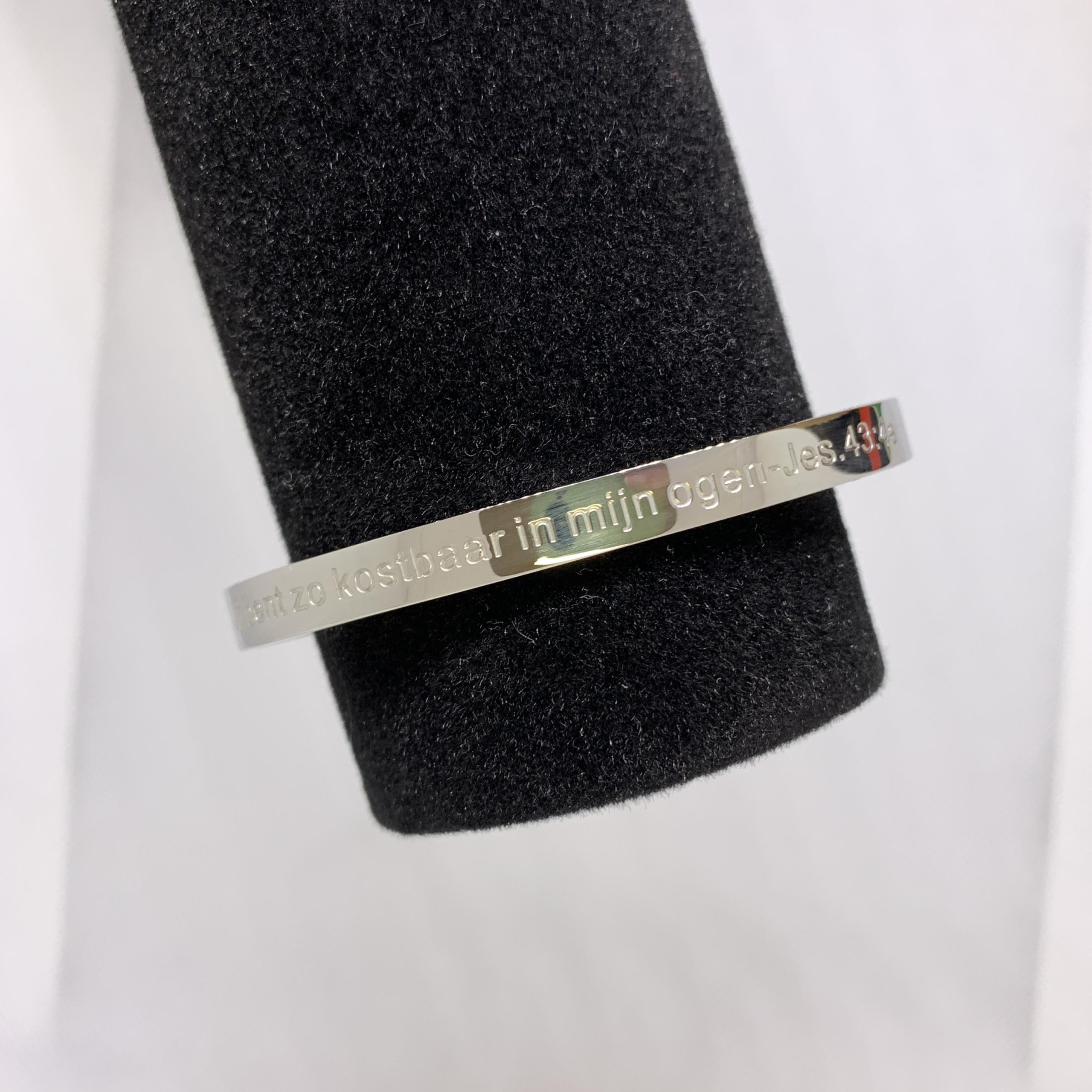 Draag een krachtige boodschap om je pols met deze elegante bangle, gegraveerd met de geliefde bijbeltekst uit Jesaja 43:4: ‘Jij bent zo kostbaar in mijn ogen.’ Verkrijgbaar in goud- en zilverkleur.