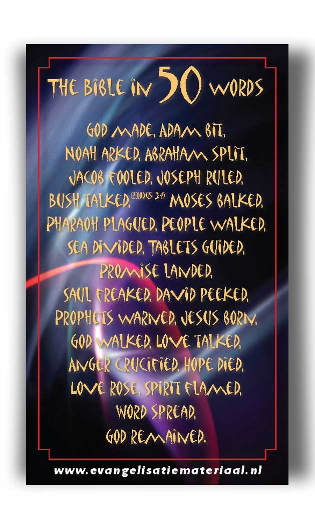 Deze Engelse kaart beschrijft in 50 woorden het verloop van de Bijbel.
