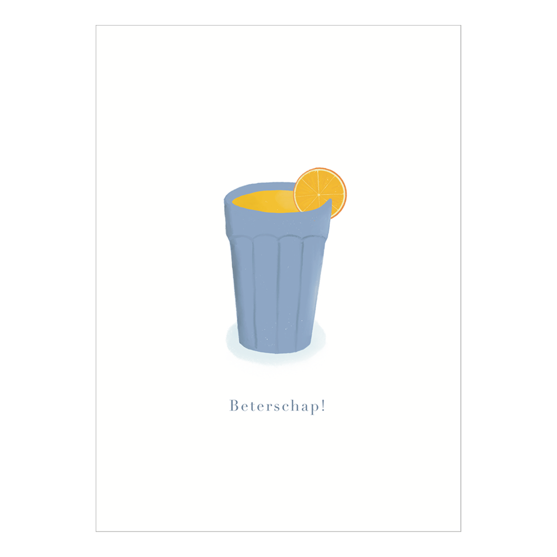 Een enkele kaart op dik papier met de afbeelding van een glas jus d’orange en de tekst ‘Beterschap’.