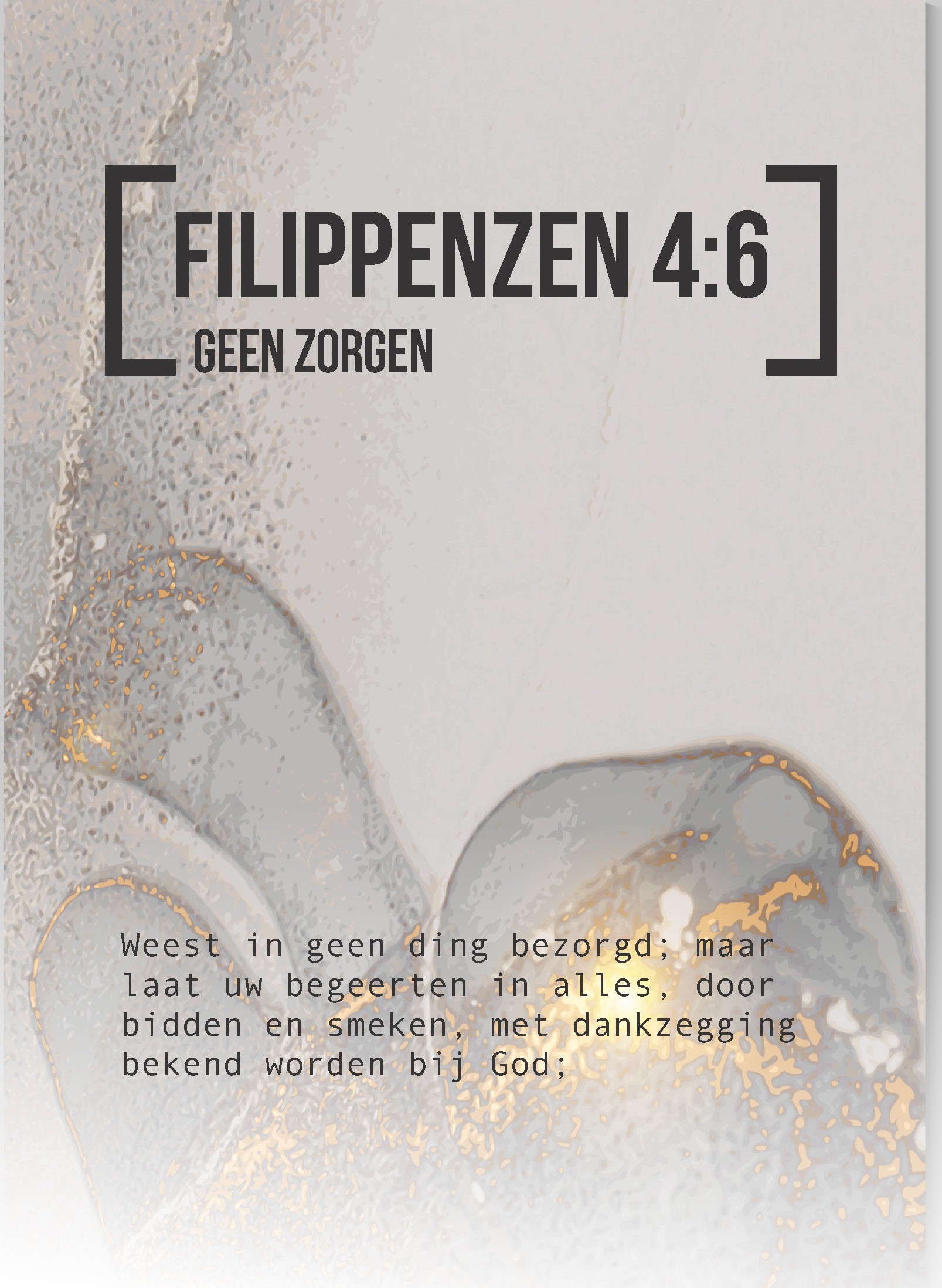 Filippenzen 4:6: ‘Weest in geen ding bezorgd; maar laat uw begeerten in alles, door bidden en smeken, met dankzegging bekend worden bij God;’. (SV)