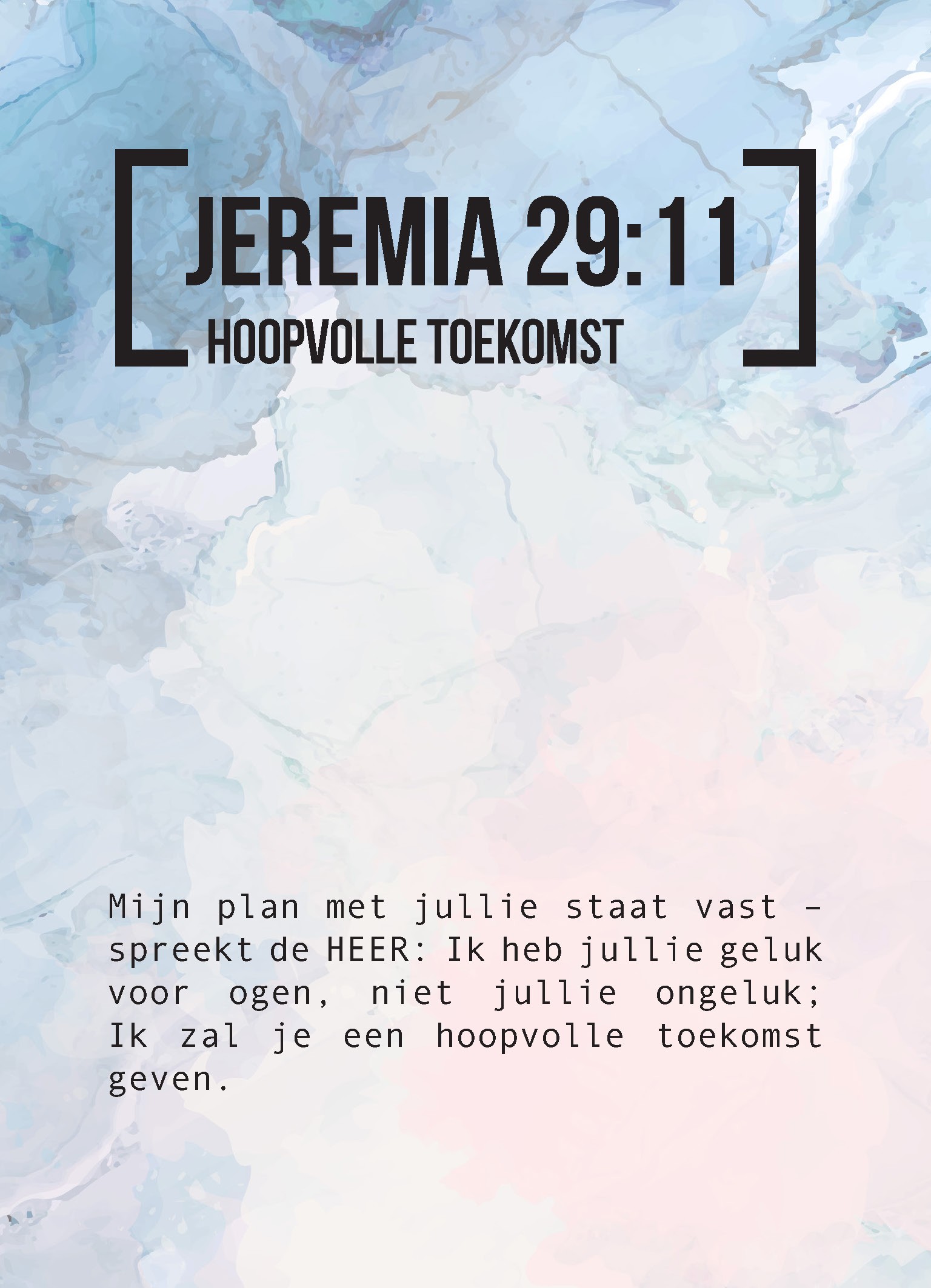 Jeremia 29:11: ‘Mijn plan met jullie staat vast – spreekt de HEER: Ik heb jullie geluk voor ogen, niet jullie ongeluk; Ik zal je een hoopvolle toekomst geven.’ (NBV21)