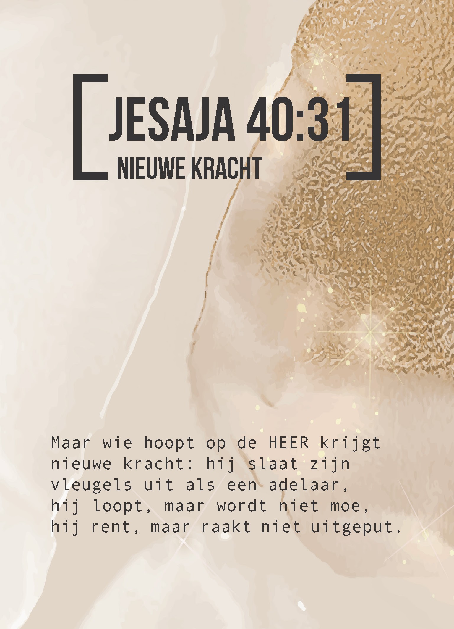Jesaja 40:31: ‘Maar wie hoopt op de Heer krijgt nieuwe kracht: hij slaat zijn vleugels uit als een adelaar, hij loopt, maar wordt niet moe, hij rent, maar raakt niet uitgeput’. (NBV21)