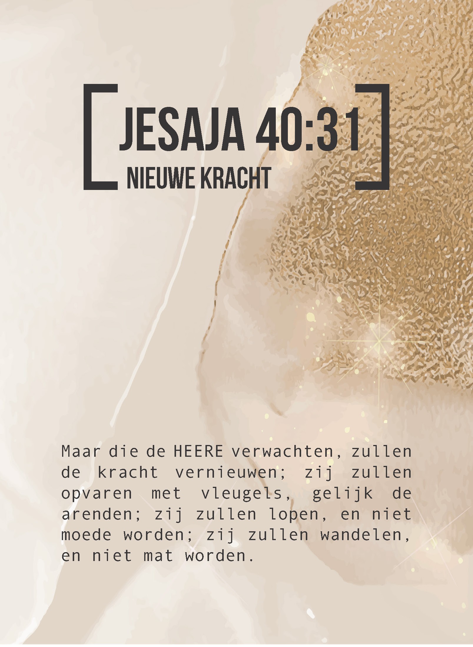 Jesaja 40:31: ‘Maar die de HEERE verwachten, zullen de kracht vernieuwen; zij zullen opvaren met vleugels, gelijk de arenden; zij zullen lopen, en niet moede worden; zij zullen wandelen, en niet mat worden’. (SV)