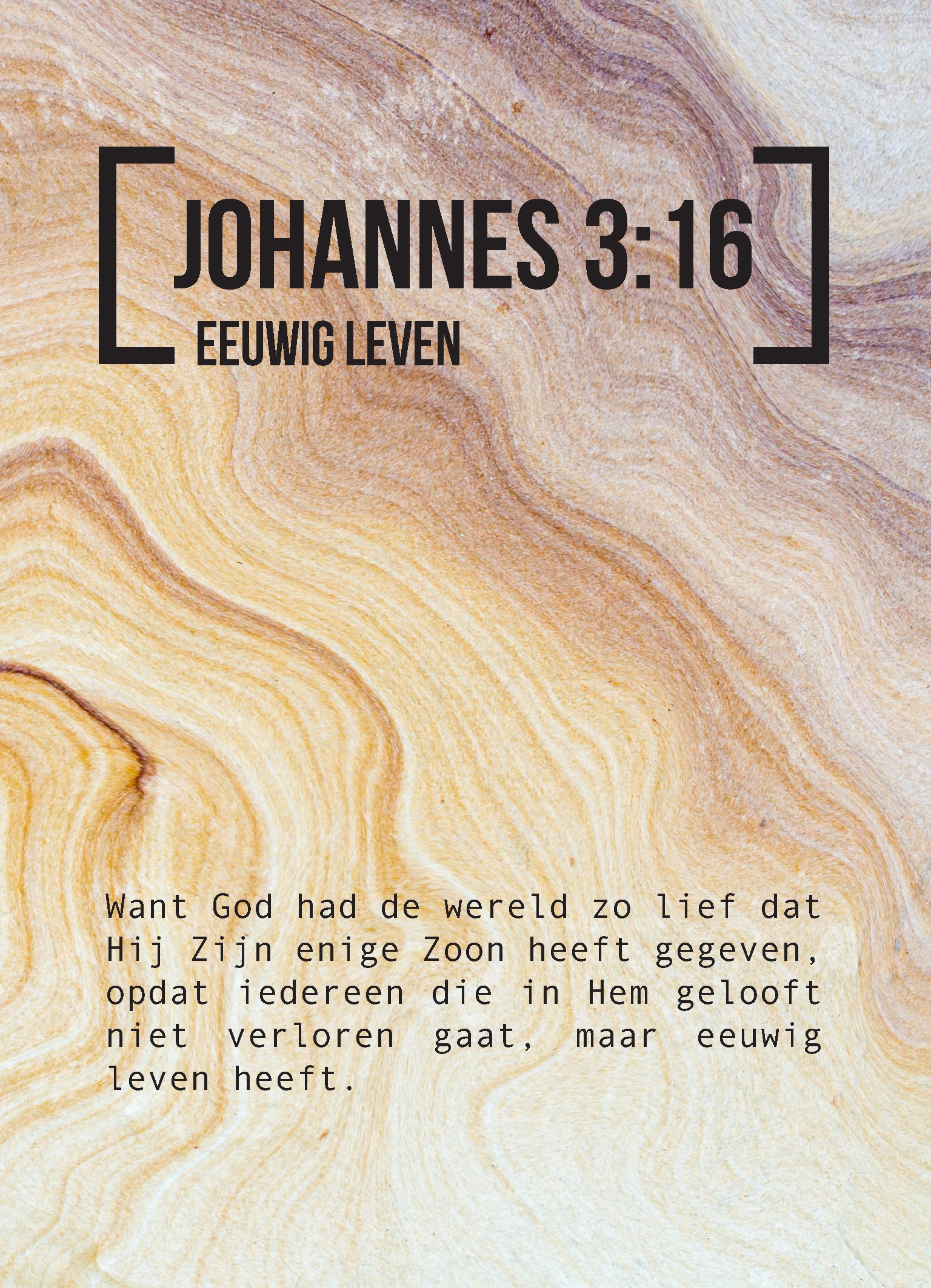 Johannes 3:16: ‘Want God had de wereld zo lief dat Hij Zijn enige Zoon heeft gegeven, opdat iedereen die in Hem gelooft niet verloren gaat, maar eeuwig leven heeft’. (NBV21)