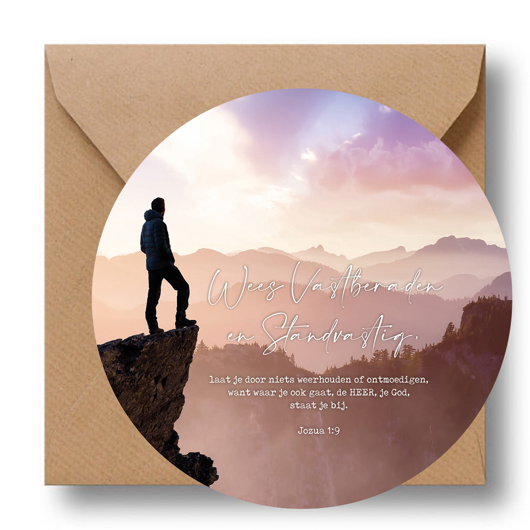 Rond cadeaubordje van karton uit de serie Cirkelcadeau met de tekst: ‘Wees vastberaden en standvastig, laat je door niets weerhouden of ontmoedigen, want waar je ook gaat, de HEER, je God, staat je bij.’