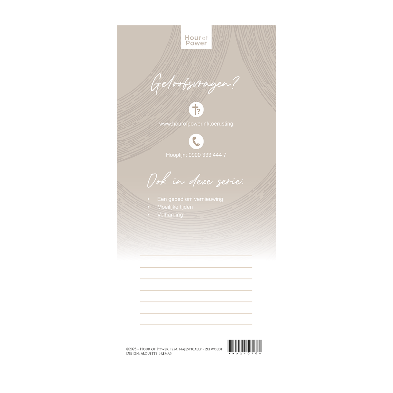 Deze kaart is tot stand gekomen in samenwerking met Hour of Power. Op de achterkant vind je een verwijzing naar de website en de HOOPlijn. Daarnaast is er ruimte om een persoonlijke boodschap toe te voegen.
