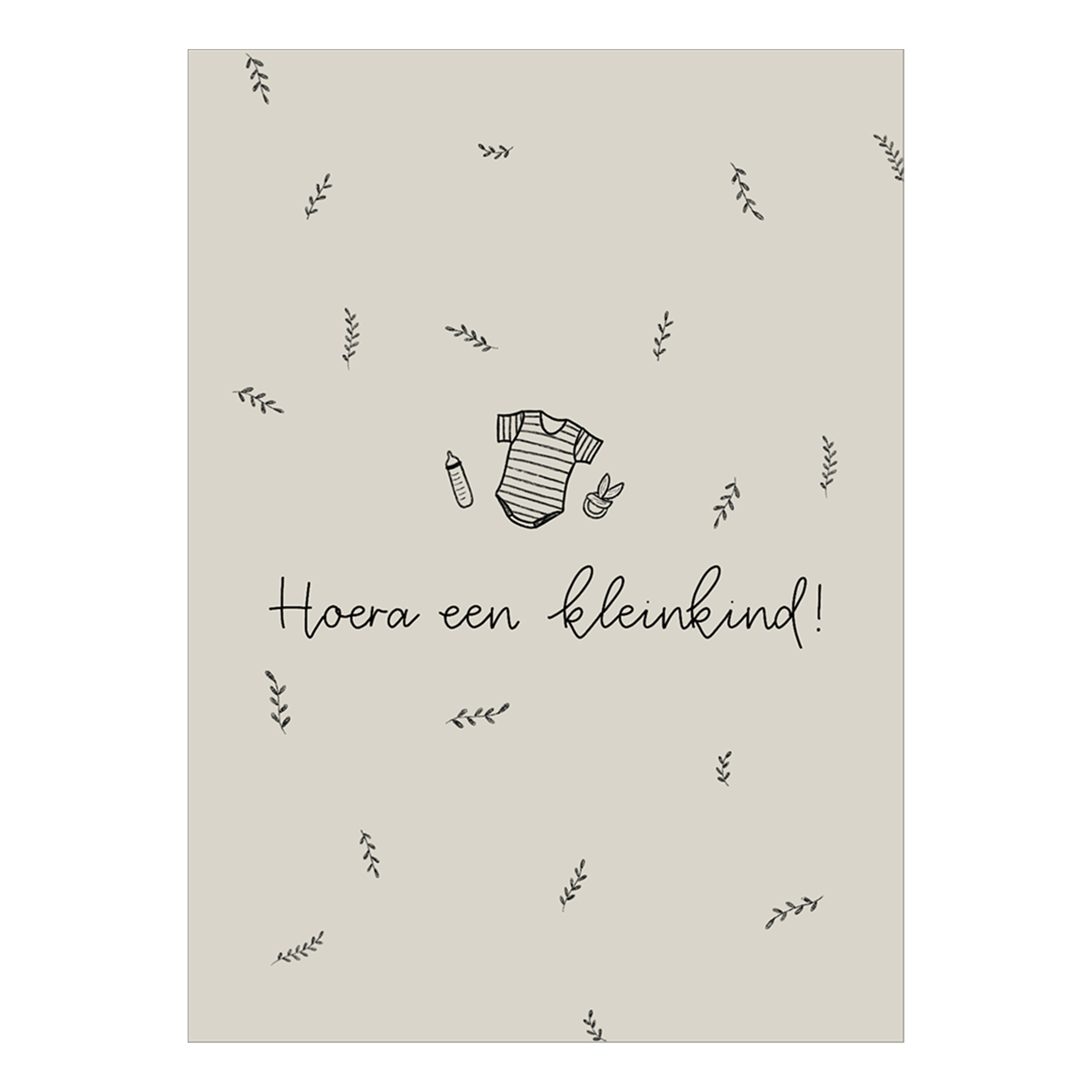 Een enkele kaart op dik papier met de afbeelding van een rompertje op een taupekleurige achtergrond en de tekst ‘Hoera een kleinkind!’
