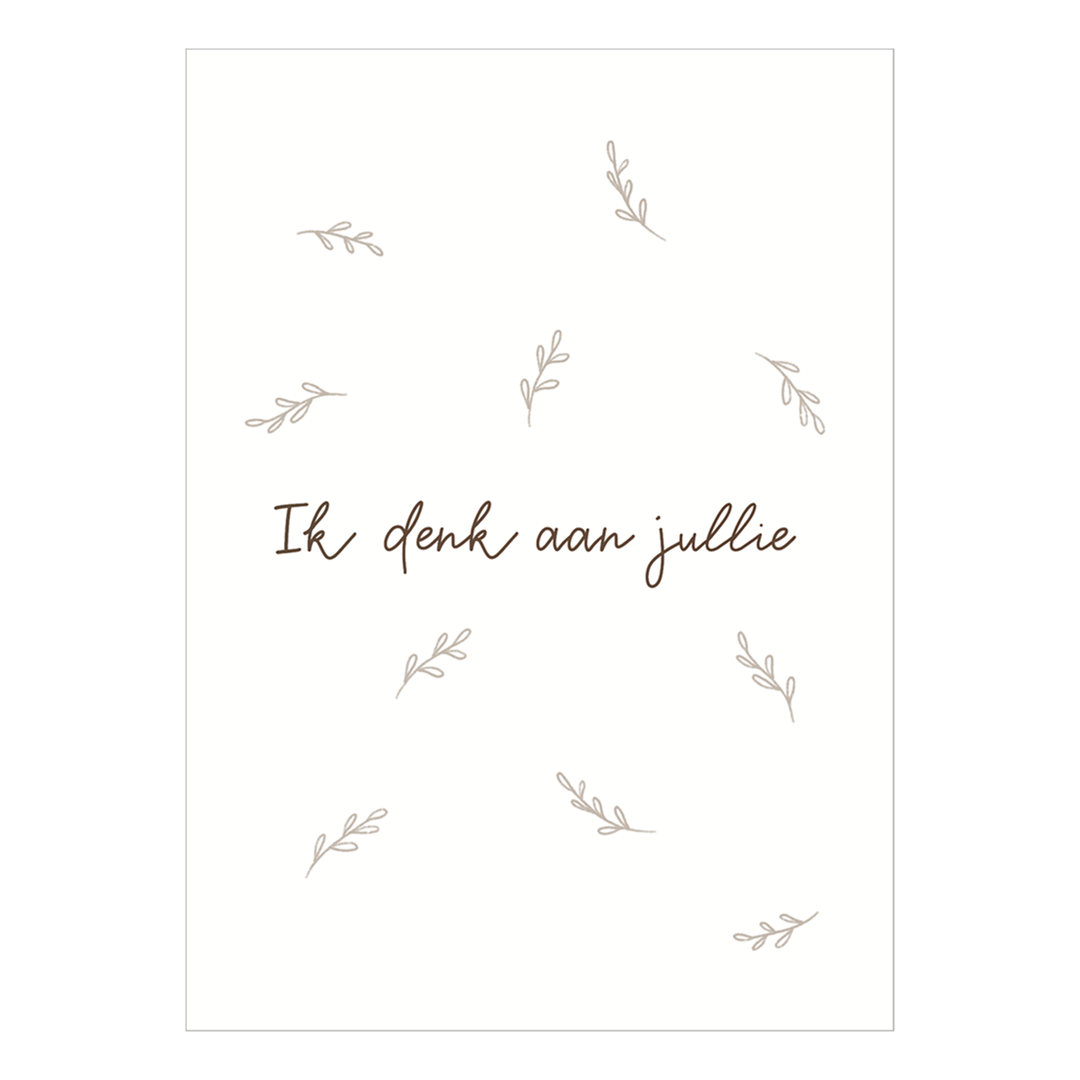Een enkele kaart op dik papier met de tekst ‘Ik denk aan jullie’.