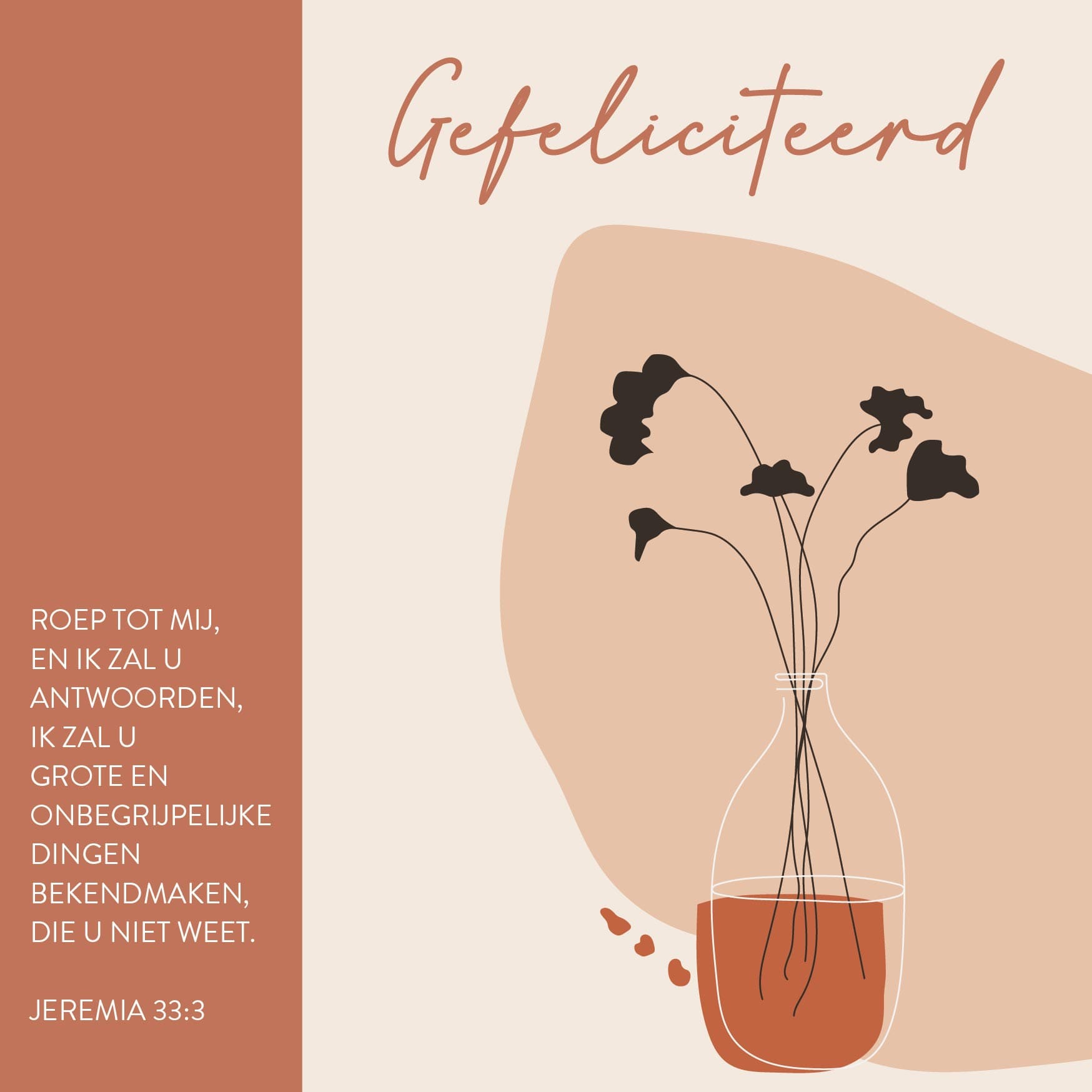Christelijke enkele kaart van ca. 15 x 15 cm met de tekst: ‘Roep tot Mij, en Ik zal u antwoorden, Ik zal u grote en onbegrijpelijke dingen bekendmaken, die u niet weet.‘ De kaart kan aan de blanco achterzijde beschreven worden. Wordt geleverd met envelop. Artikelnummer: MA56001