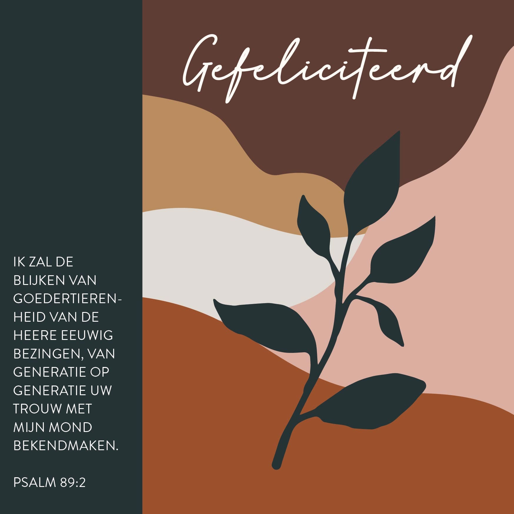 Christelijke enkele kaart van ca. 15 x 15 cm met de tekst: ‘Ik zal de blijken van goedertierenheid van de HEERE eeuwig bezingen,van generatie op generatie Uw trouw met mijn mond bekendmaken.’ De kaart kan aan de blanco achterzijde beschreven worden. Wordt geleverd met envelop. Artikelnummer: MA56022