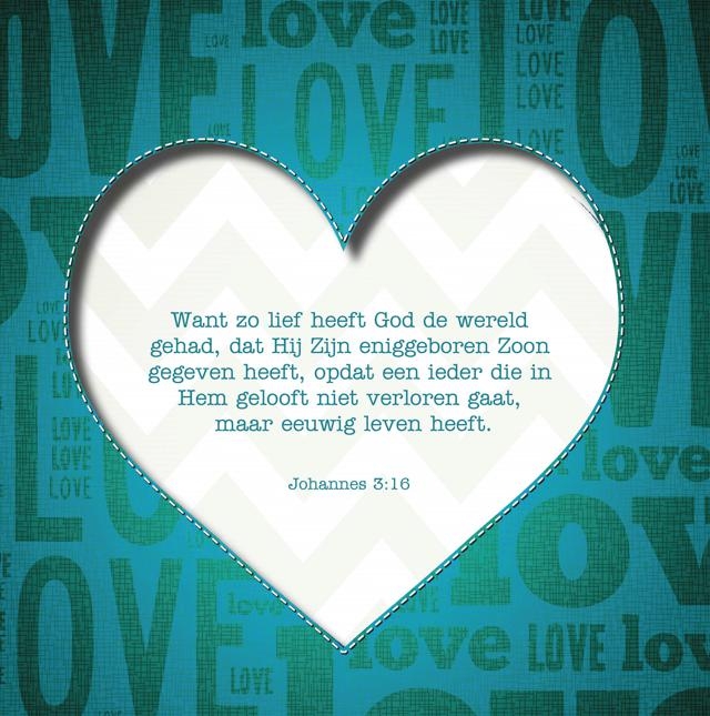 Want zo lief heeft God de wereld gehad, dat Hij Zijn eniggeboren Zoon gegeven heeft, opdat een ieder die in Hem gelooft niet verloren gaat, maar eeuwig leven heeft.