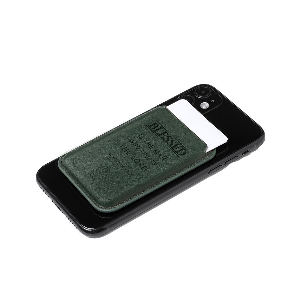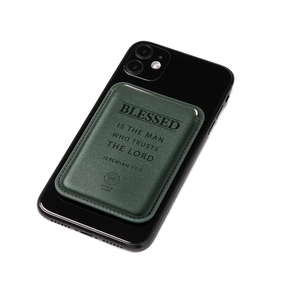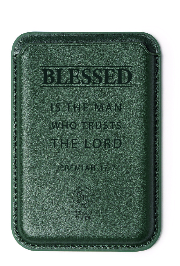 Superhandige, magnetische kaarthouder voor op je mobiele telefoon met de mooie tekst: Blessed is the man who trusts the lord – Jeremiah 17:7
