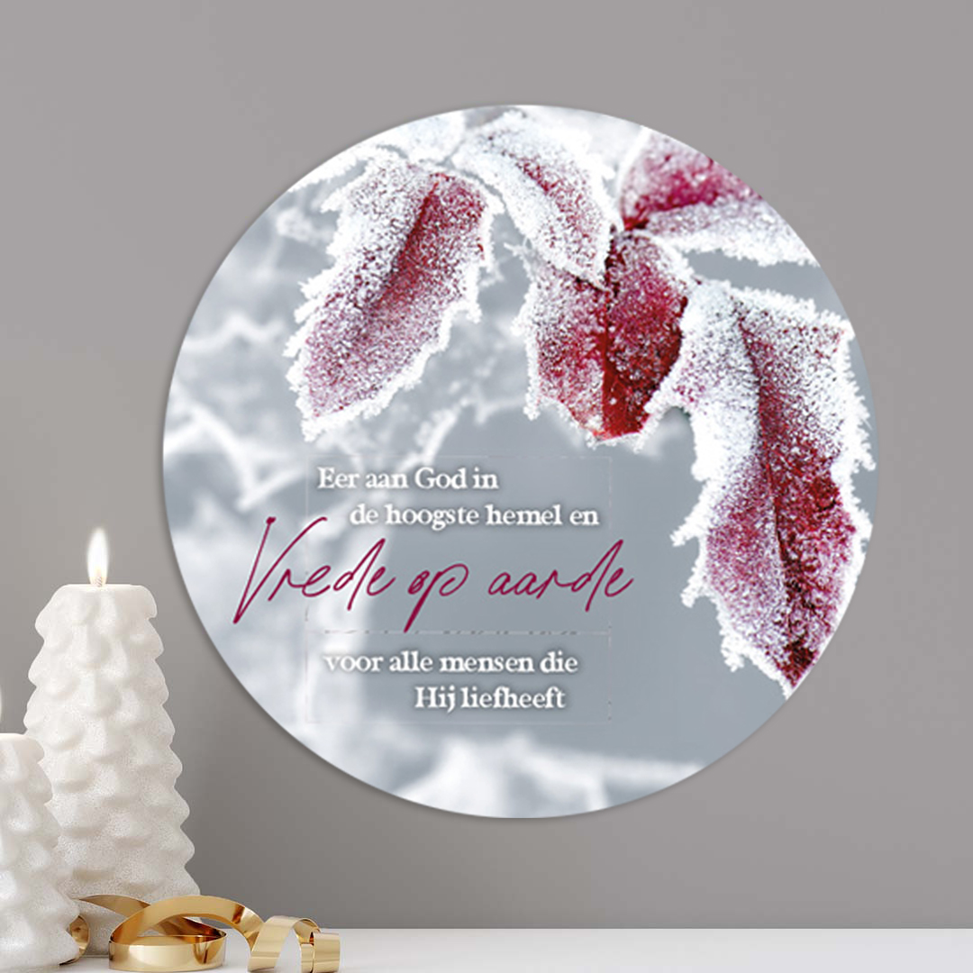 Rond bord in kerstsfeer met de tekst ‘Eer aan God in de hoogste hemel en vrede op aarde voor alle mensen die Hij liefheeft’