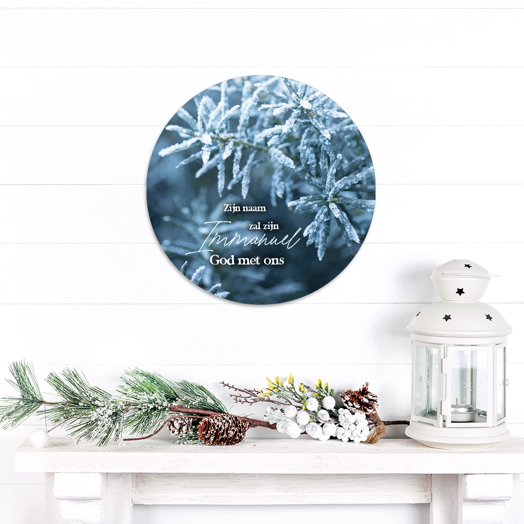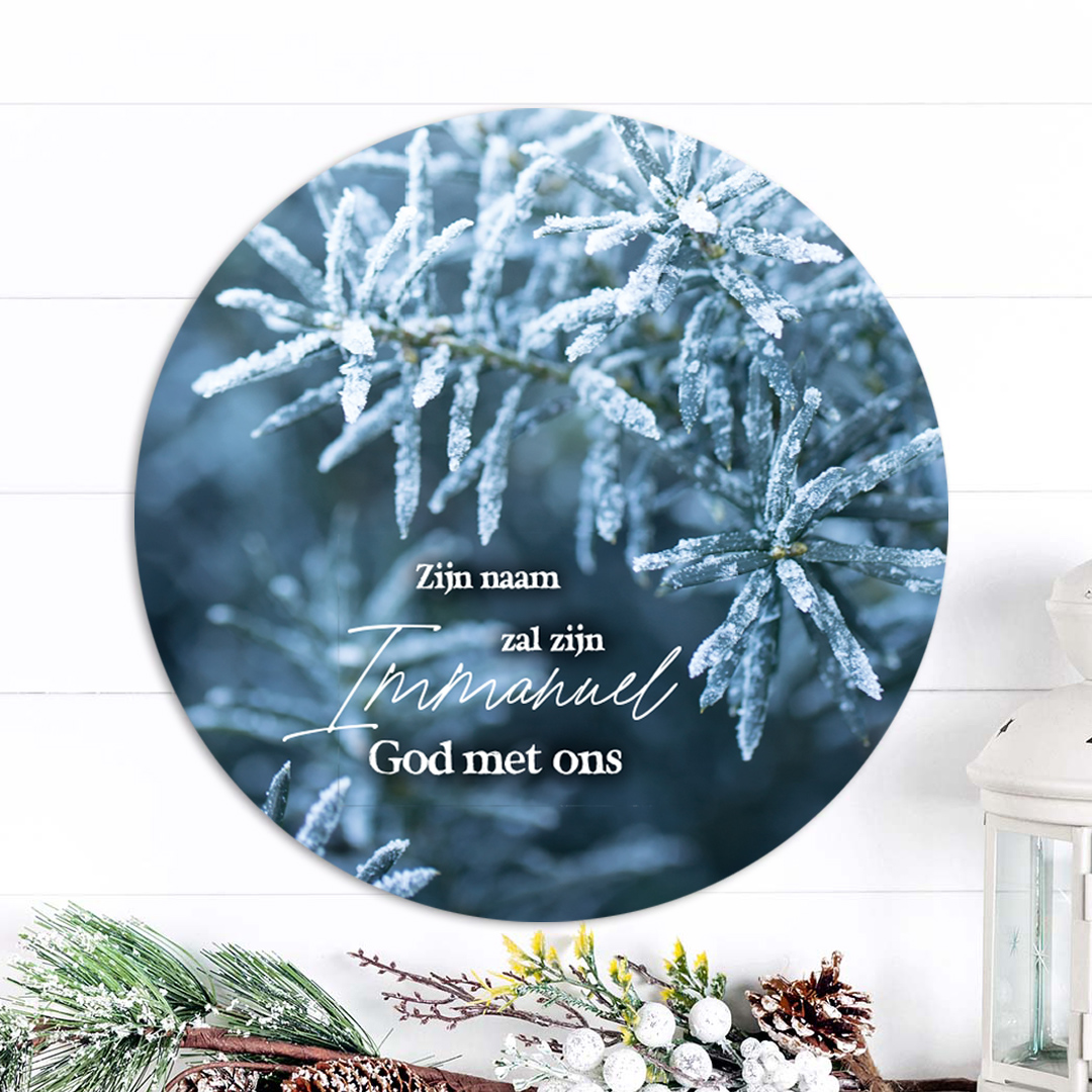 Rond bord in kerstsfeer met de tekst ‘Zijn naam zal zijn Immanuel, God met ons’