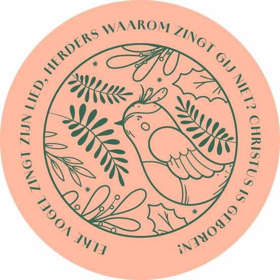 Deze zalmkleurige, ronde kerstkaart is versierd met een een vogel en kerstgroen.