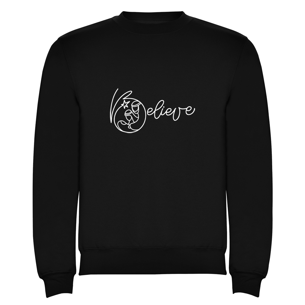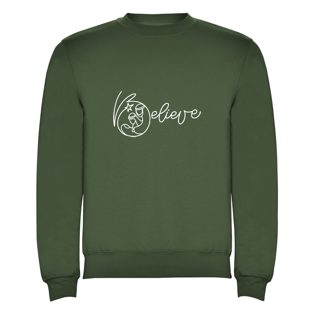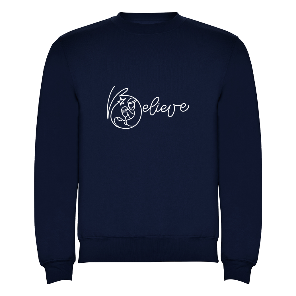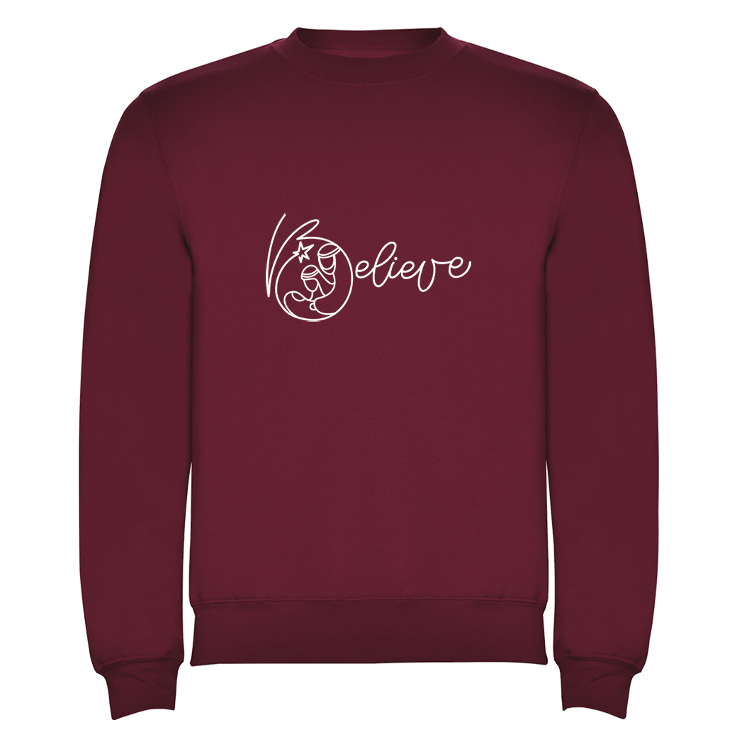 Op de voorzijde staat de grote tekst ‘Believe’, vergezeld door een afbeelding van Jozef, Maria, baby Jezus en een ster.
