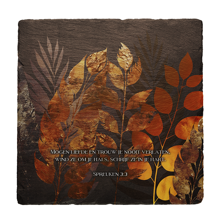 Deze elegante leisteen met een afbeeldingen van goudkleurige takken en de tekst uit Spreuken 3:3 is ideaal als decoratie in huis of als een speciaal cadeau.