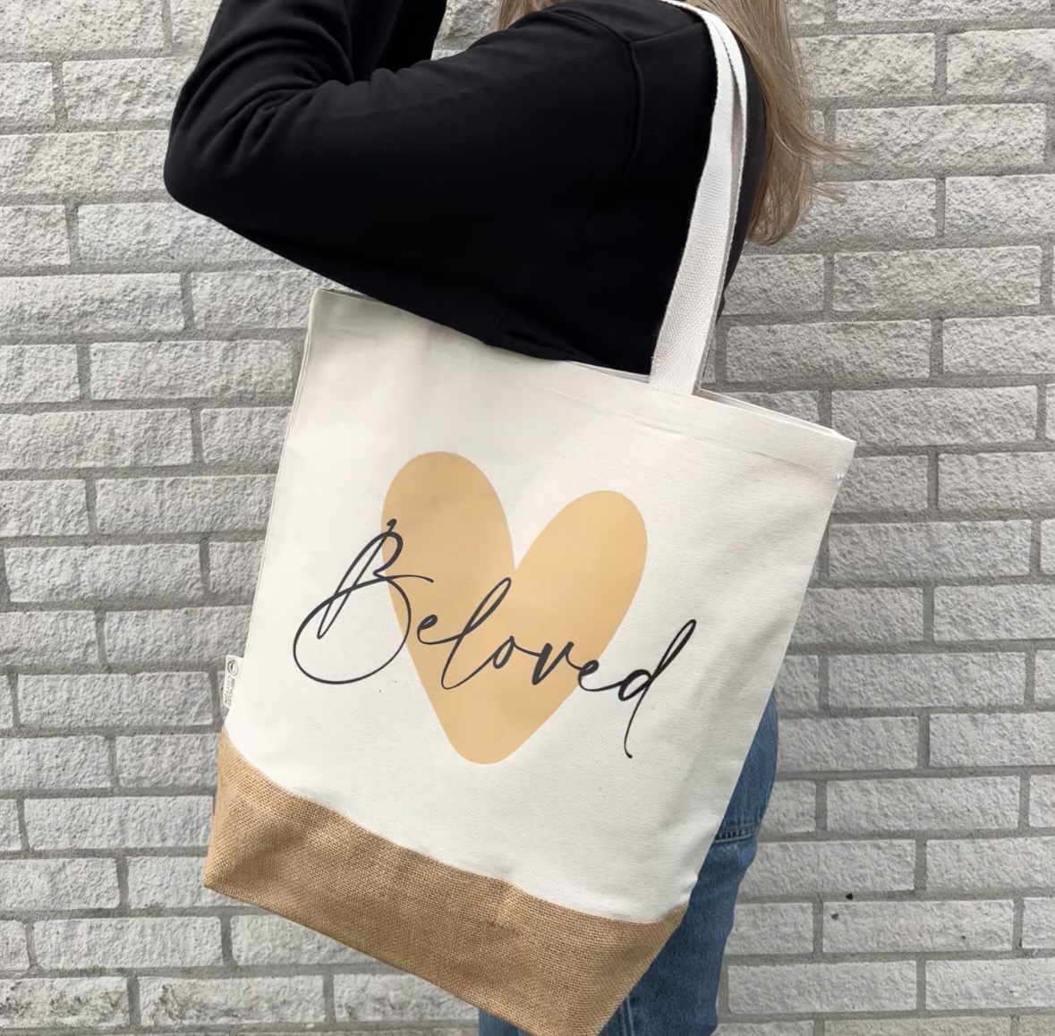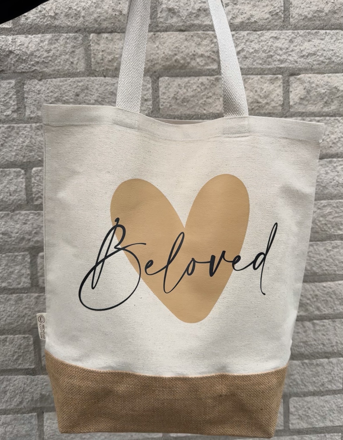 Linnen schoudertas bedrukt met de tekst ‘Beloved’.