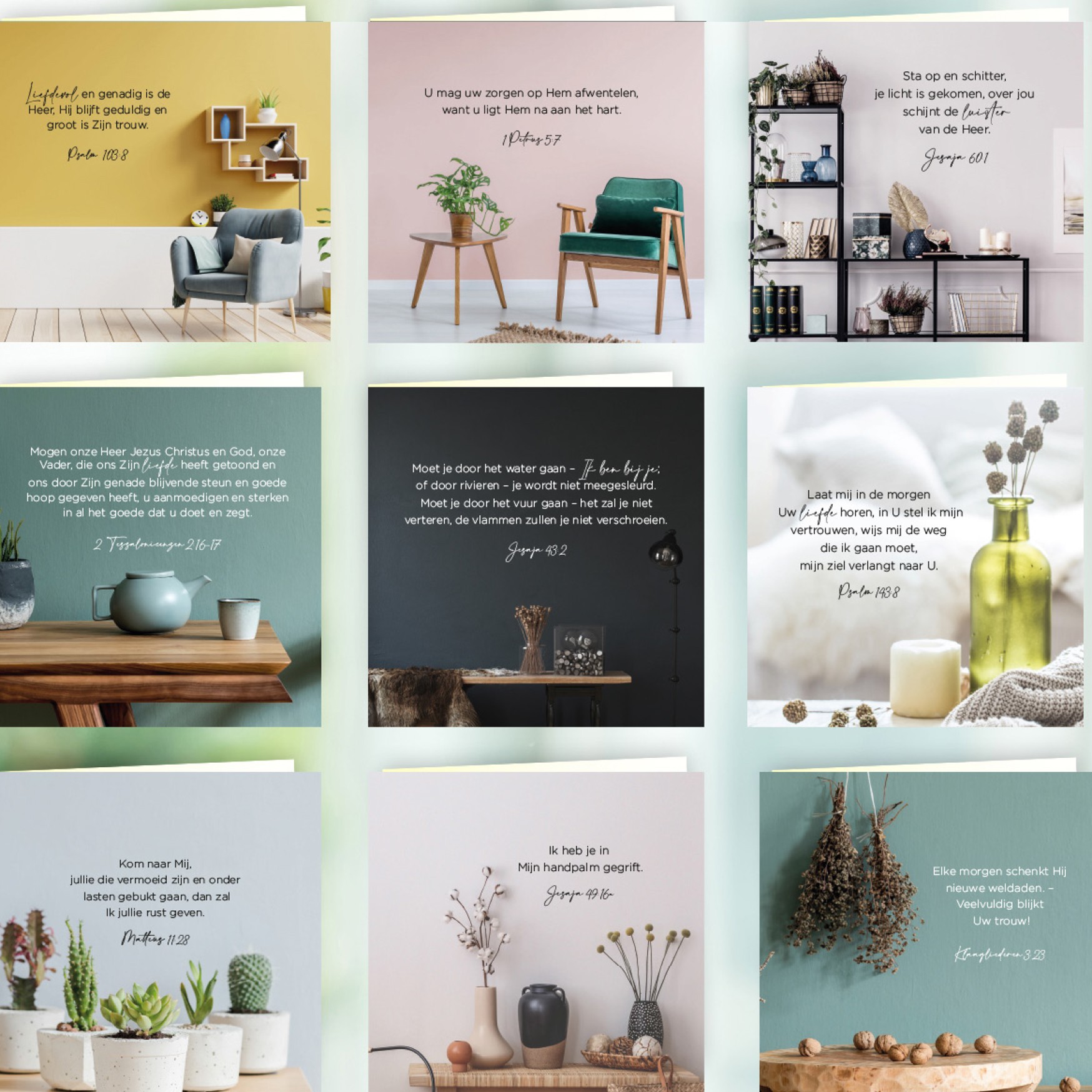 Luxe set, van 9 sfeervolle wenskaarten met Bijbeltekst. Deze set past bij de bureauklapper ‘Je bent geliefd’ en wordt geleverd met envelop.