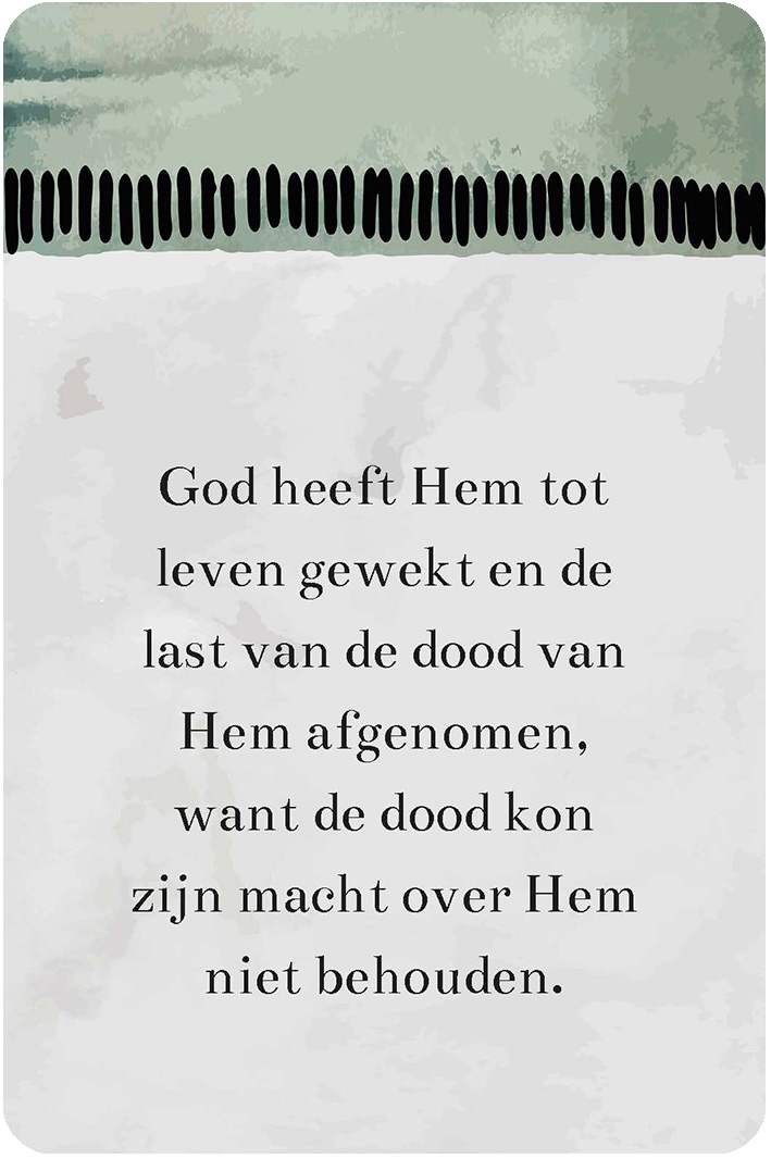 Leuk minikaartje met de tekst ‘God heeft Hem tot leven gewekt en de last van de dood van Hem afgenomen, want de dood kon zijn macht over Hem niet behouden’. Perfect om een persoonlijke boodschap toe te voegen aan je cadeau of om een liefdevolle boodschap aan een geliefde te schrijven. De kaarten hebben een blanco achterzijde, zodat deze goed beschreven kan worden.