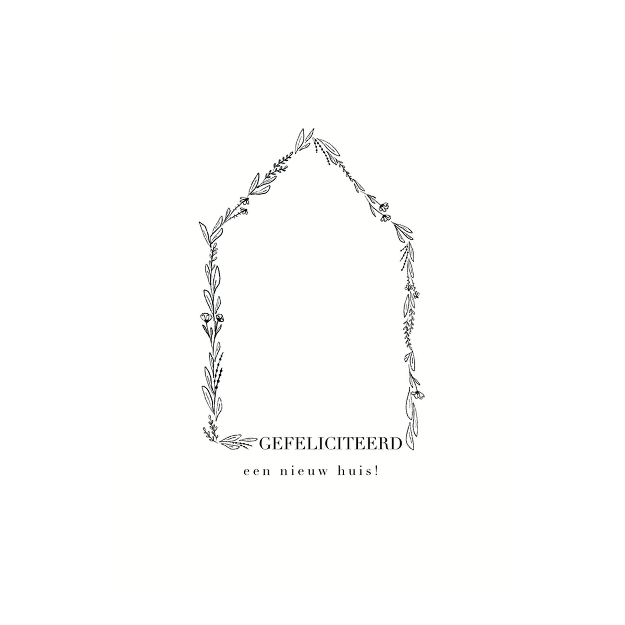 Een enkele kaart op dik papier met de afbeelding van een huisje en de tekst ‘Gefeliciteerd een nieuw huis!’