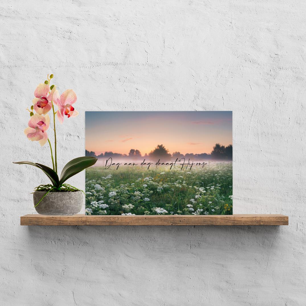 Prachtig duurzaam bord van plexiglas met de tekst ‘Dag aan dag draagt Hij ons’.