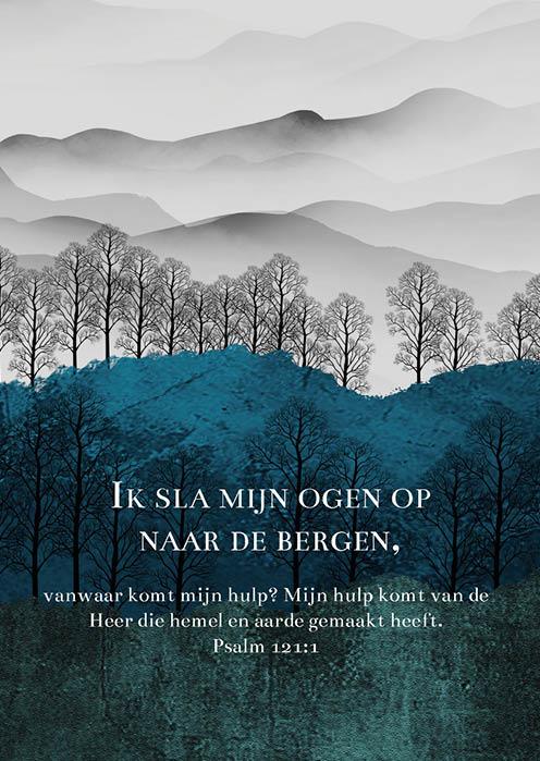 Poster met vers 1 van Psalm 121. Beschikbaar in A3-formaat en 50×70 cm. Deze poster is ook verkrijgbaar als kaart. (link naar MA55045)