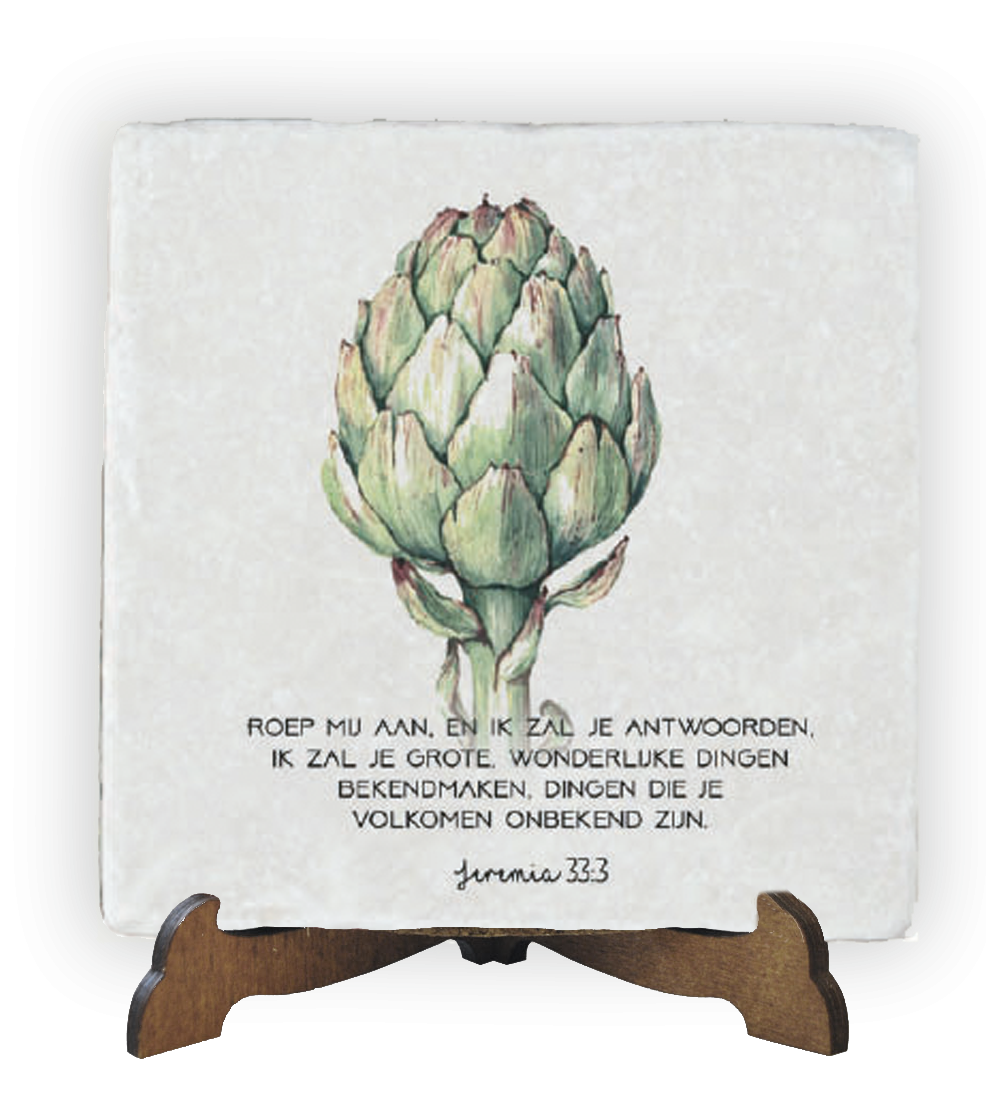 De tegel is een getrommelde steen en heeft daardoor afgesleten randen die een oude, nostalgische sfeer uitstralen. Origineel en duurzaam. Inclusief houdertje om de steen neer te zetten.