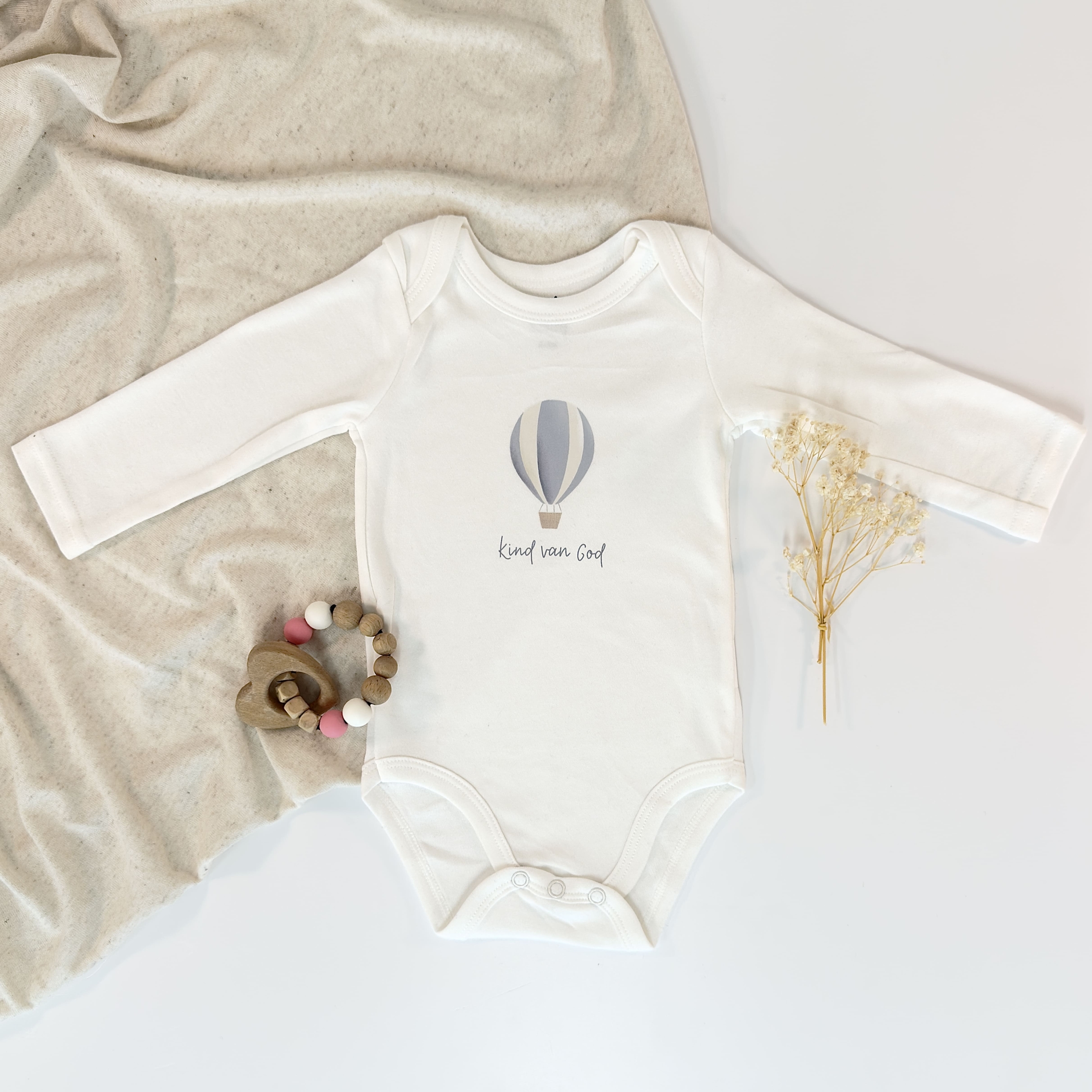 Dit schattige witte rompertje is bedrukt met de bemoedigende tekst ‘Kind van God’ en een sierlijke blauwe luchtballon. Gemaakt van zacht, ademend katoen en voorzien van een handige drukknoopsluiting voor extra gemak.