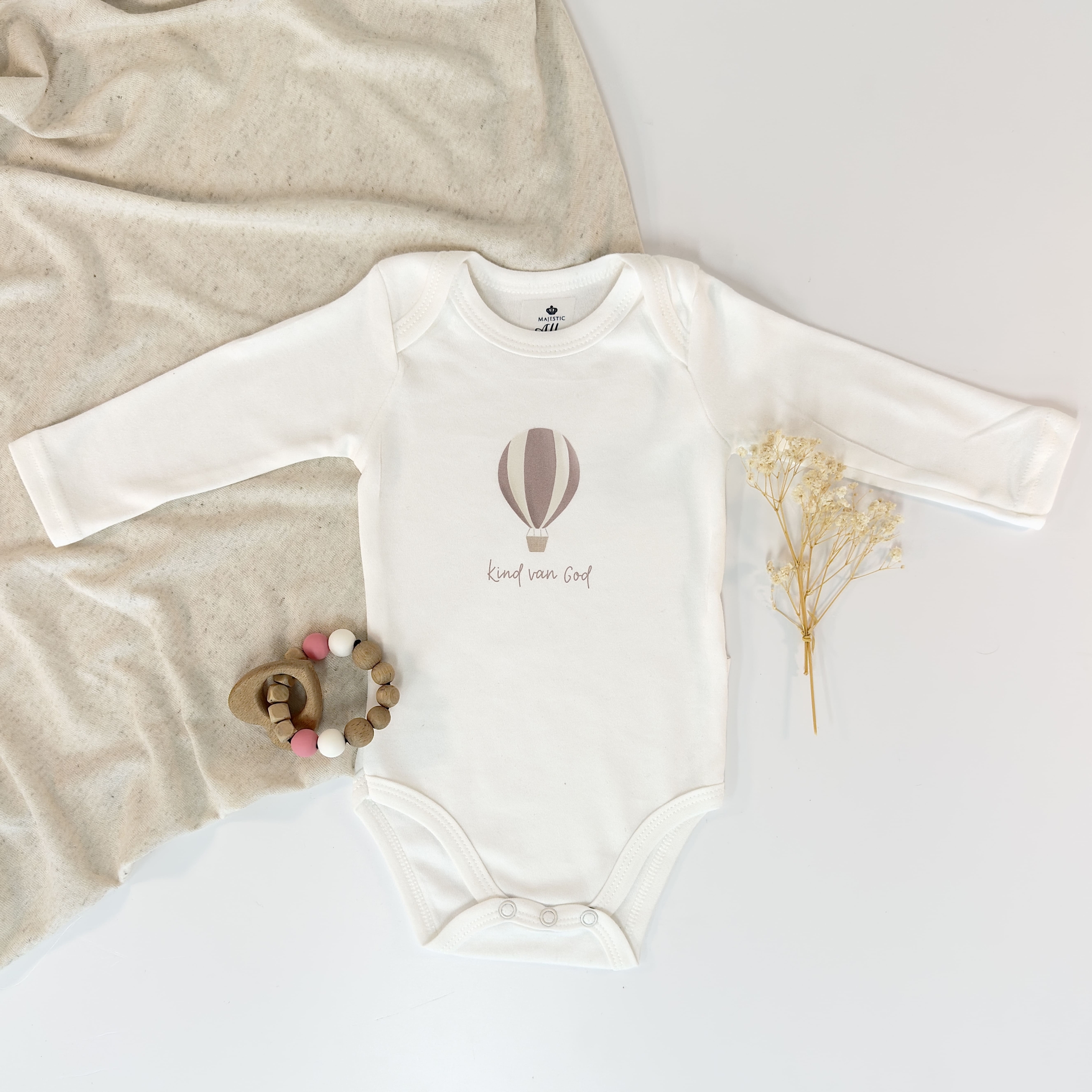 Dit schattige witte rompertje is bedrukt met de bemoedigende tekst ‘Kind van God’ en een sierlijke roze luchtballon. Gemaakt van zacht, ademend katoen en voorzien van een handige drukknoopsluiting voor extra gemak.