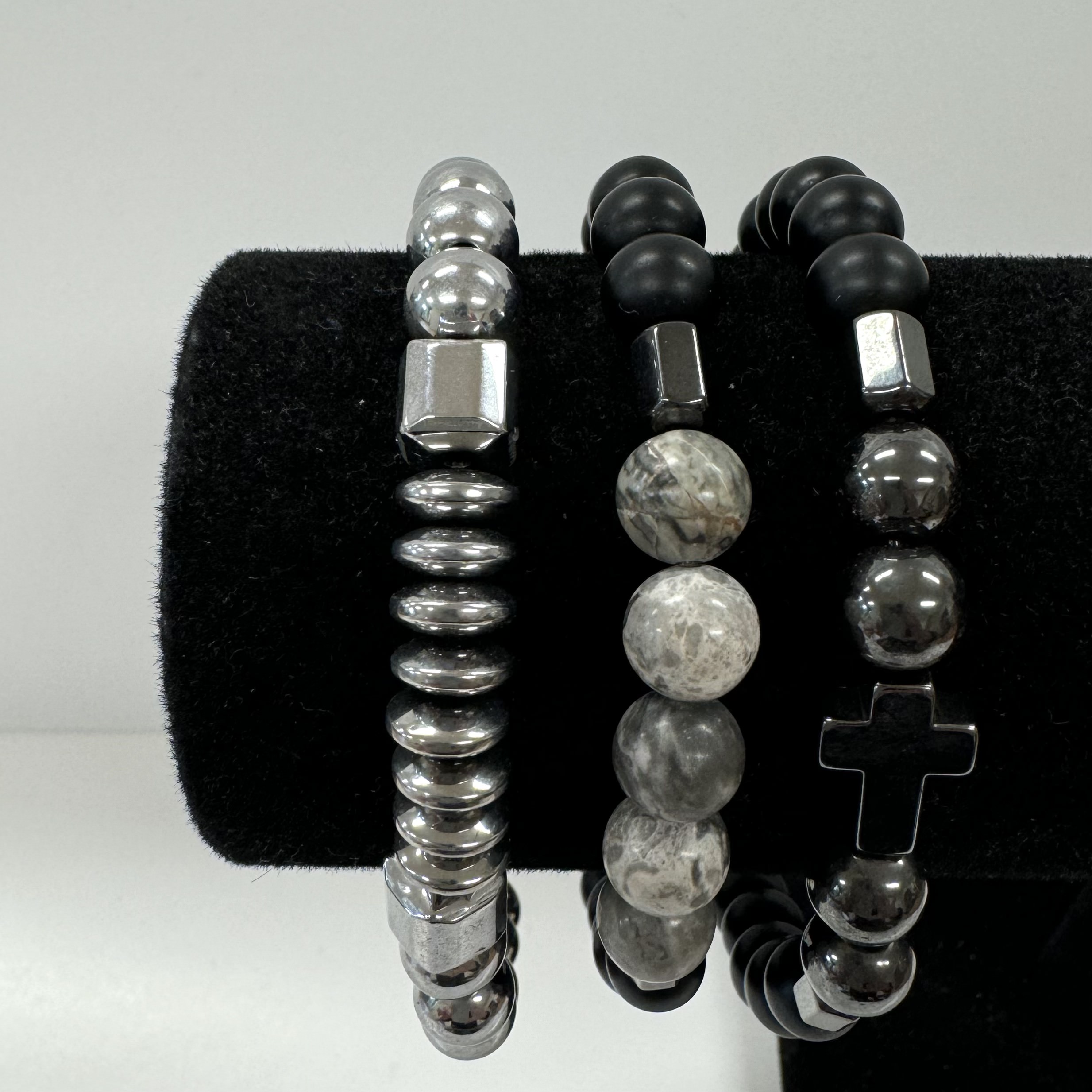 Een stoere, maar toch elegante armbandenset voor heren, gemaakt van kralen en met kruissymbool.