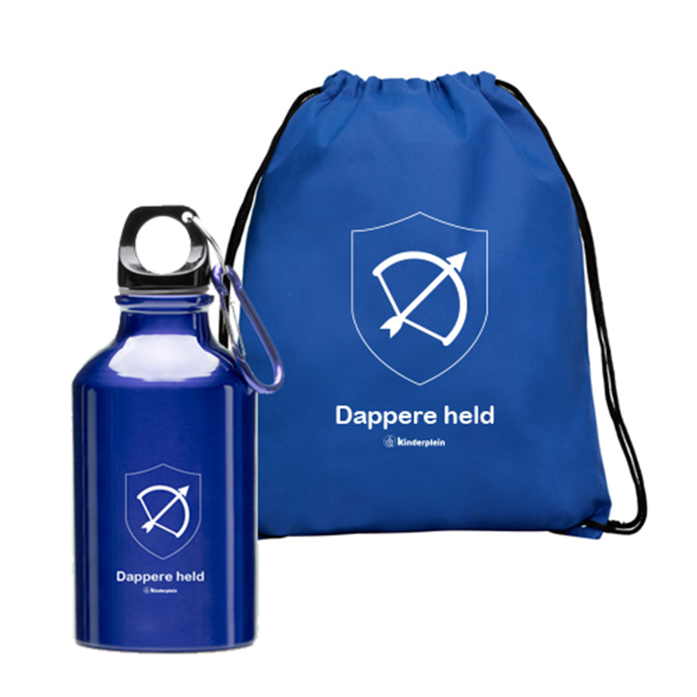 Deze set, bestaande uit een blauwe rugtas en aluminium waterfles, is het perfecte cadeau voor kinderen. Met een stoere afbeelding van een pijl en boog en de tekst ‘Dappere held’, geïnspireerd door een geliefd opwekkingslied, is dit een cadeau met betekenis.