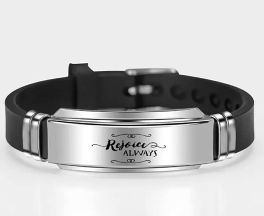 Stoere silliconenarmband met de inspirerende tekst: ‘Rejoice always’. Deze armband moedigt je aan om altijd verheugd te zijn, precies zoals de Bijbel ons leert in Filippenzen 4:4.