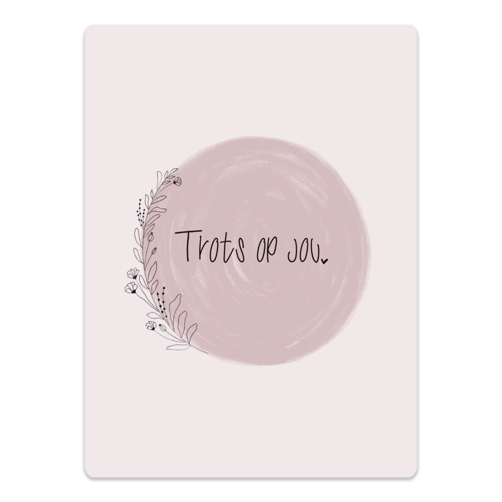 Verras iemand met dit cadeaubordje in roze tinten met de tekst "Trots op jou", omringd door een elegante bloemenkrans. Een prachtig geschenk om waardering en trots te uiten.