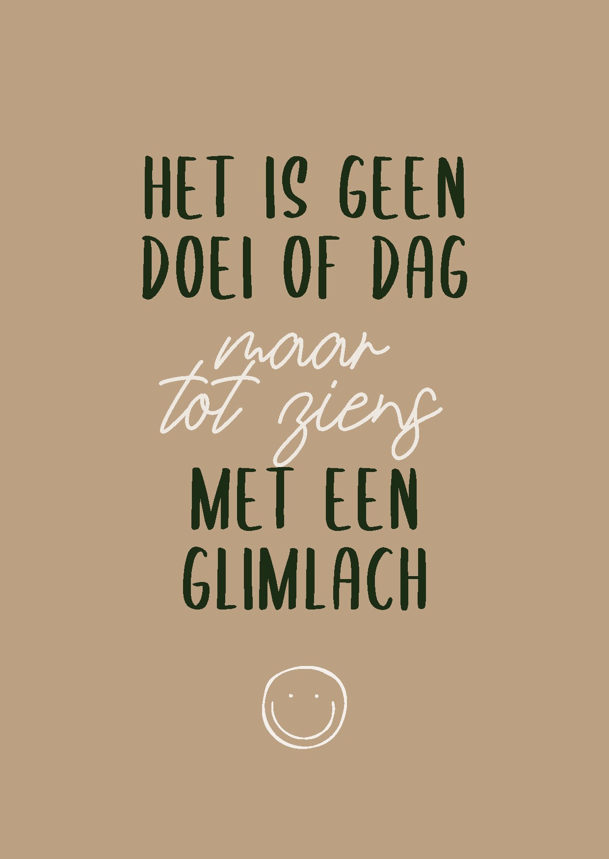Christelijke dubbele kaart van ca 11×16 cm met de tekst: ‘Het is geen doei of dag, maar tot ziens met een glimlach’